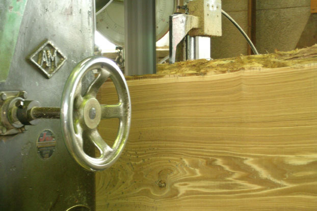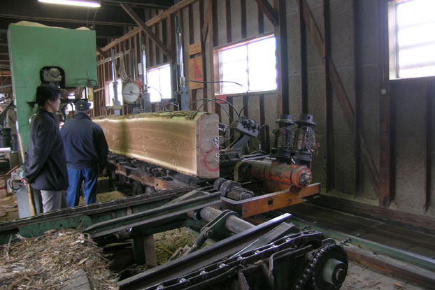 木工場の製材機に乗せ、一回目のノコを何処に通すか!!ここが重要ポイントで この丸太を生かすも殺すも このノコにかかって来ます。