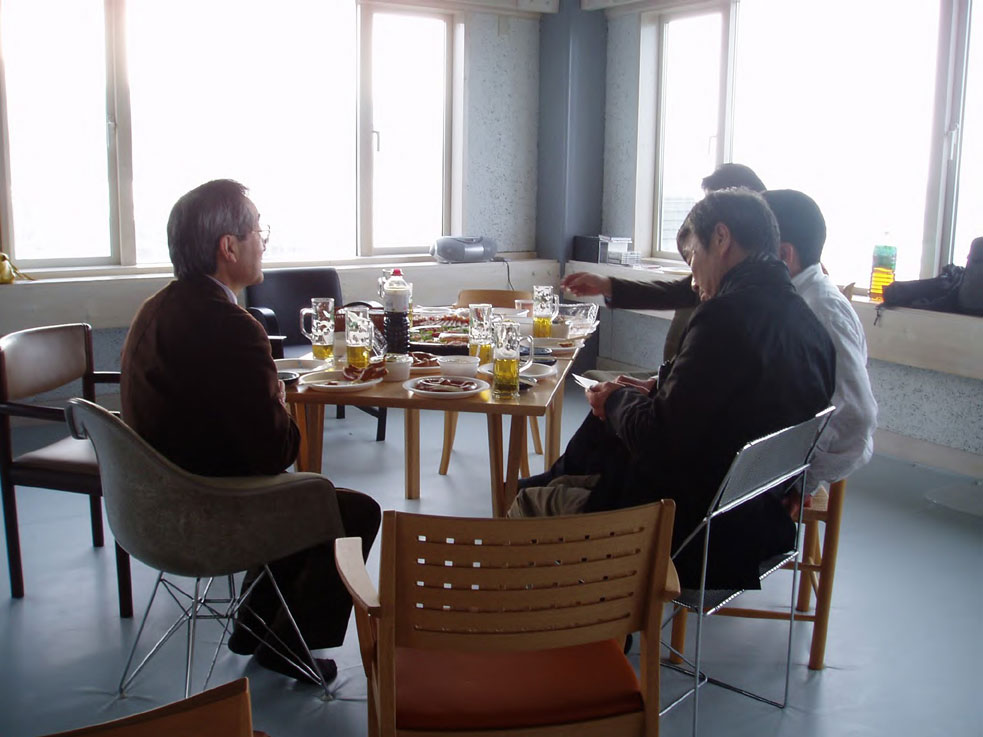次はオランダの新進気鋭MVRDVの設計した「まつだい雪国農耕文化村センター」(写真4)。建物は構造的にも面白いのでぜひ一見の価値ある施設です。中には地元の野菜をつかった料理専門の食堂(写真5)もあります。食堂は地元の人たちが自宅から撮った風景の写真を天井にディスプレイされ、鏡のテーブルに農村の風景が映し出されていました。廊下では、この集落の人たちの歓迎、呼びかけの声がスピーカーから流れていたりします。